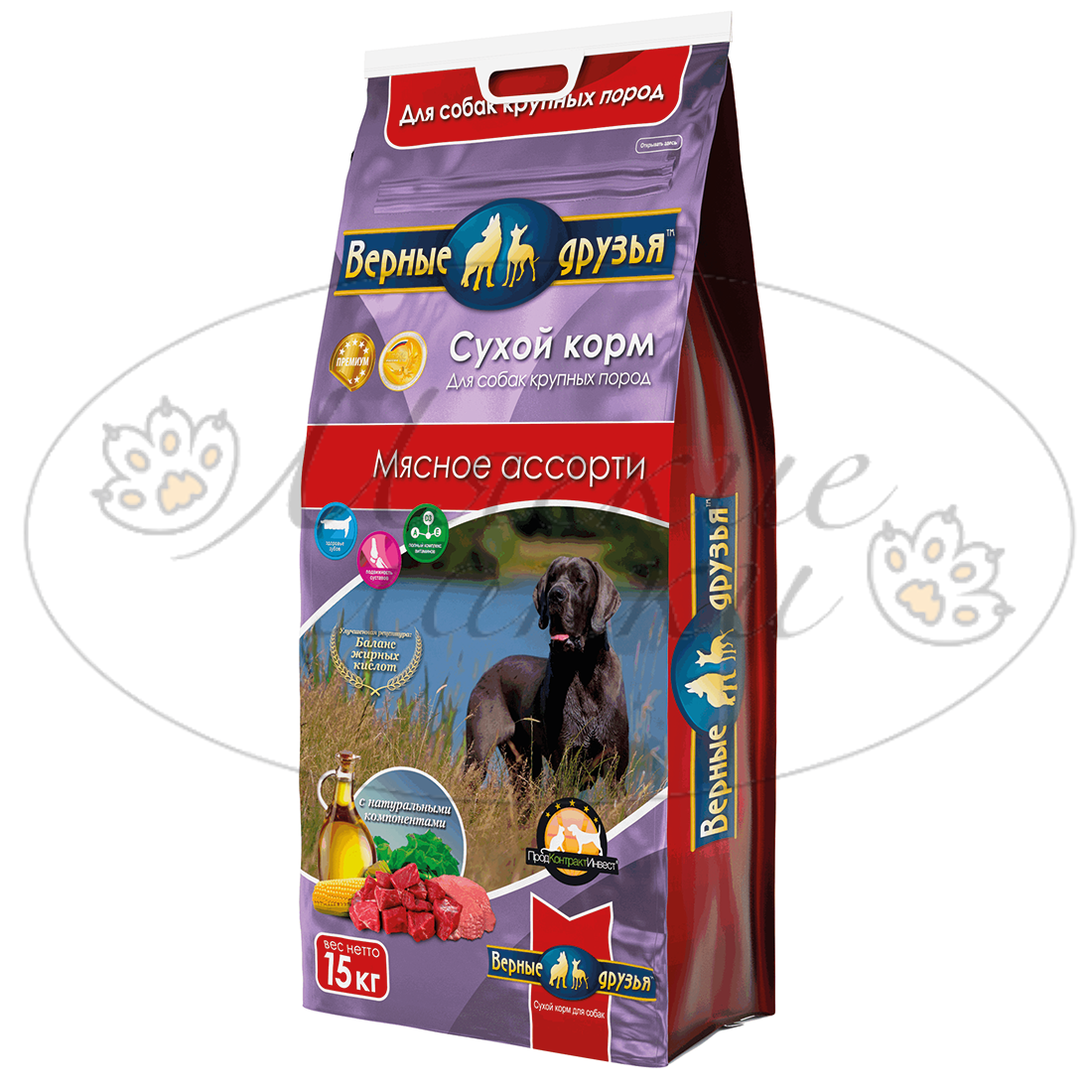 Гранулы корма обогащены незаменимыми жирными кислотами Омега-3 и Омега-6, которые обеспечивают суточную потребность собак крупных пород в этих кислотах.