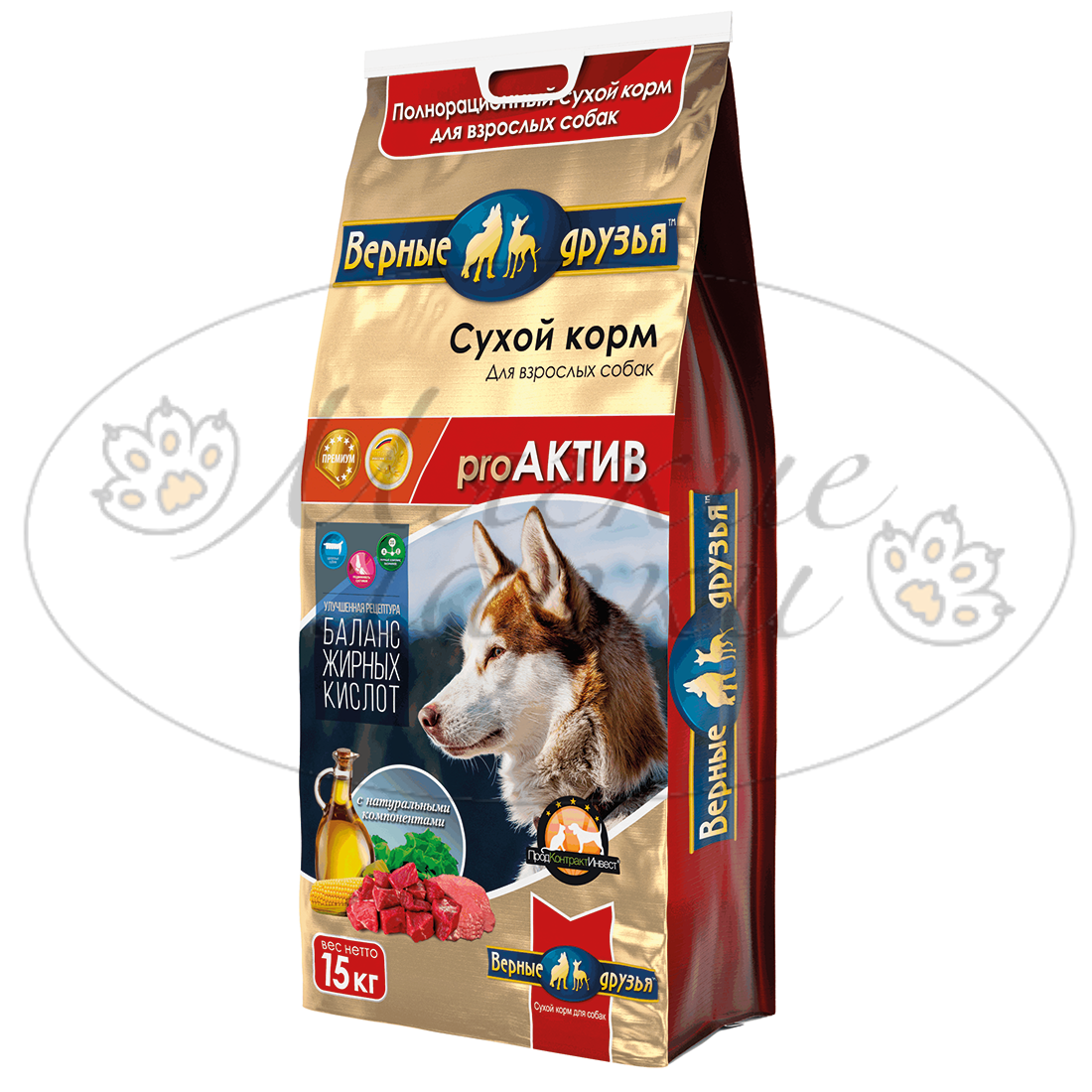 Полнорационный сухой корм «proАКТИВ» для взрослых собак всех пород «Верные друзья» может использоваться как единственный продукт вскармливания.